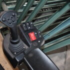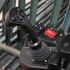 Compact Arm Pod with CAN Rocker Switches and Custom Joystick Assembly for Forestry Application. Angled, Dual Axis Joystick Assembly is Designed with Proportional Thumb Sliders.
