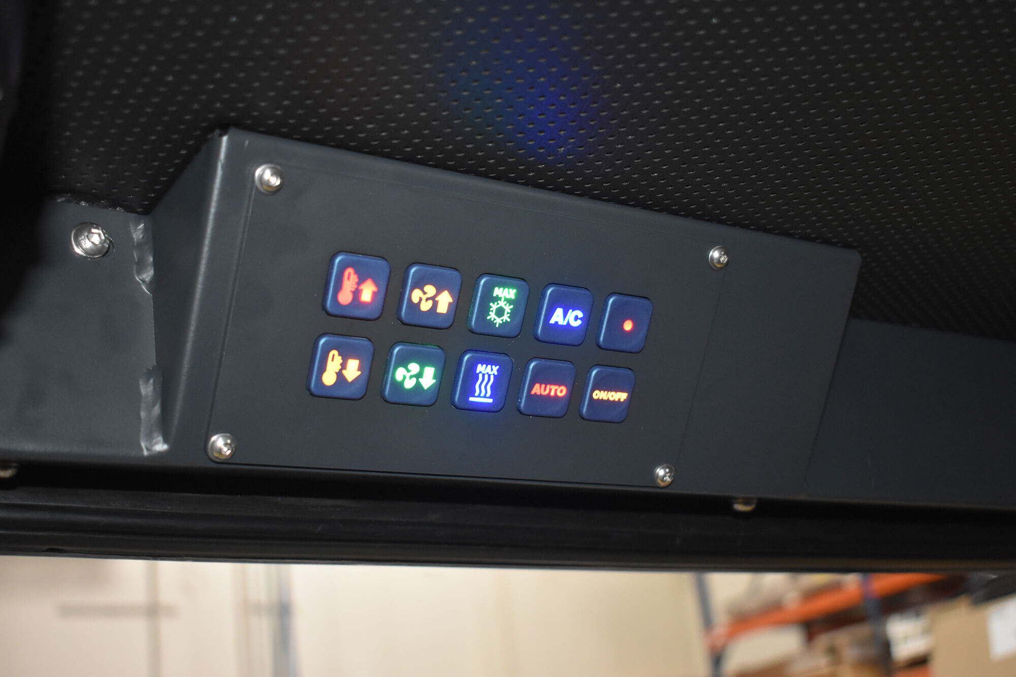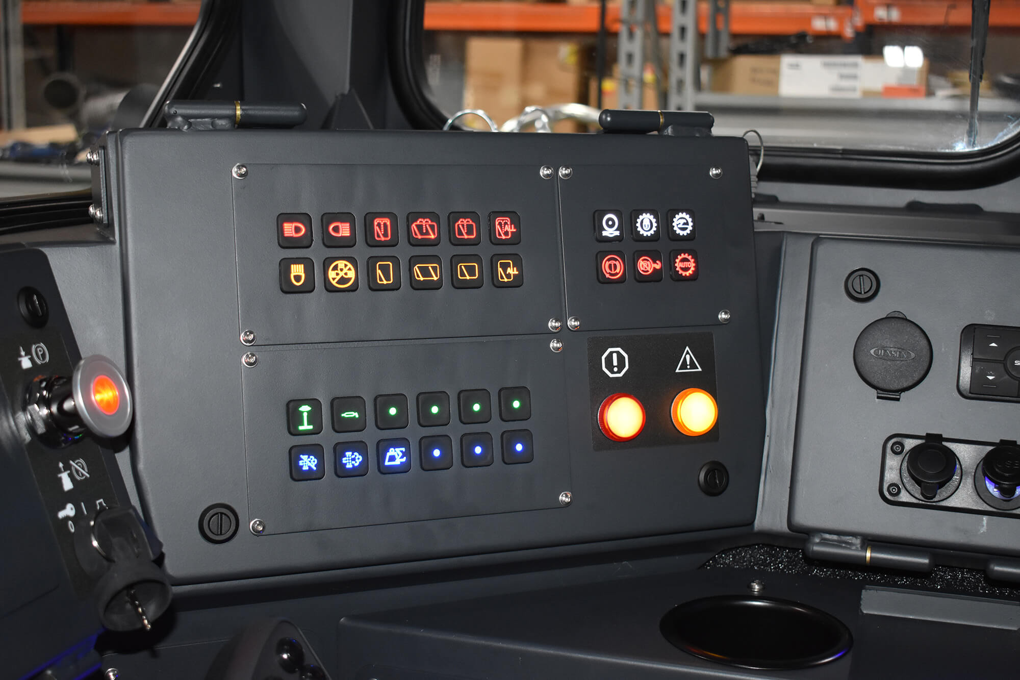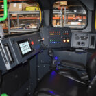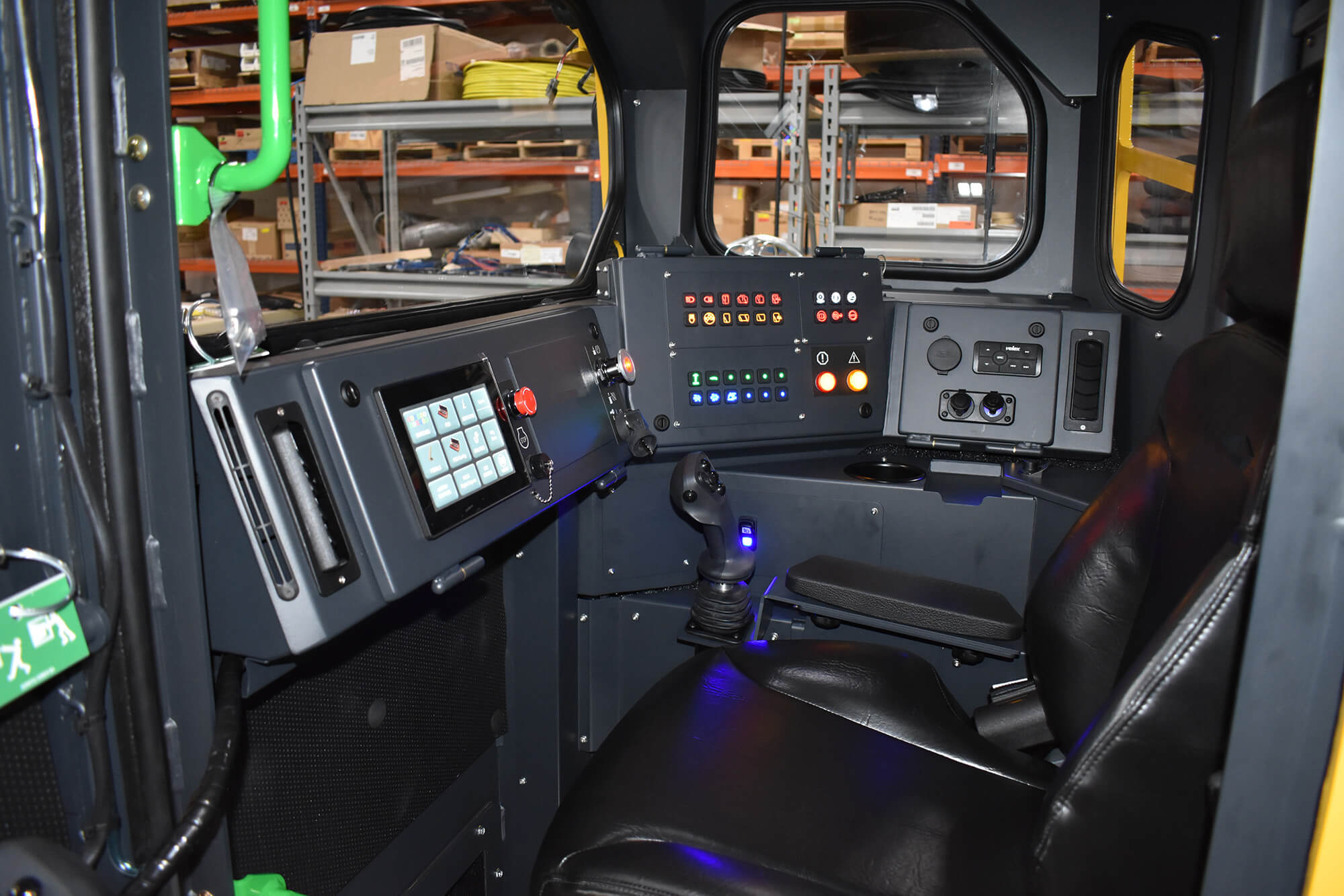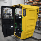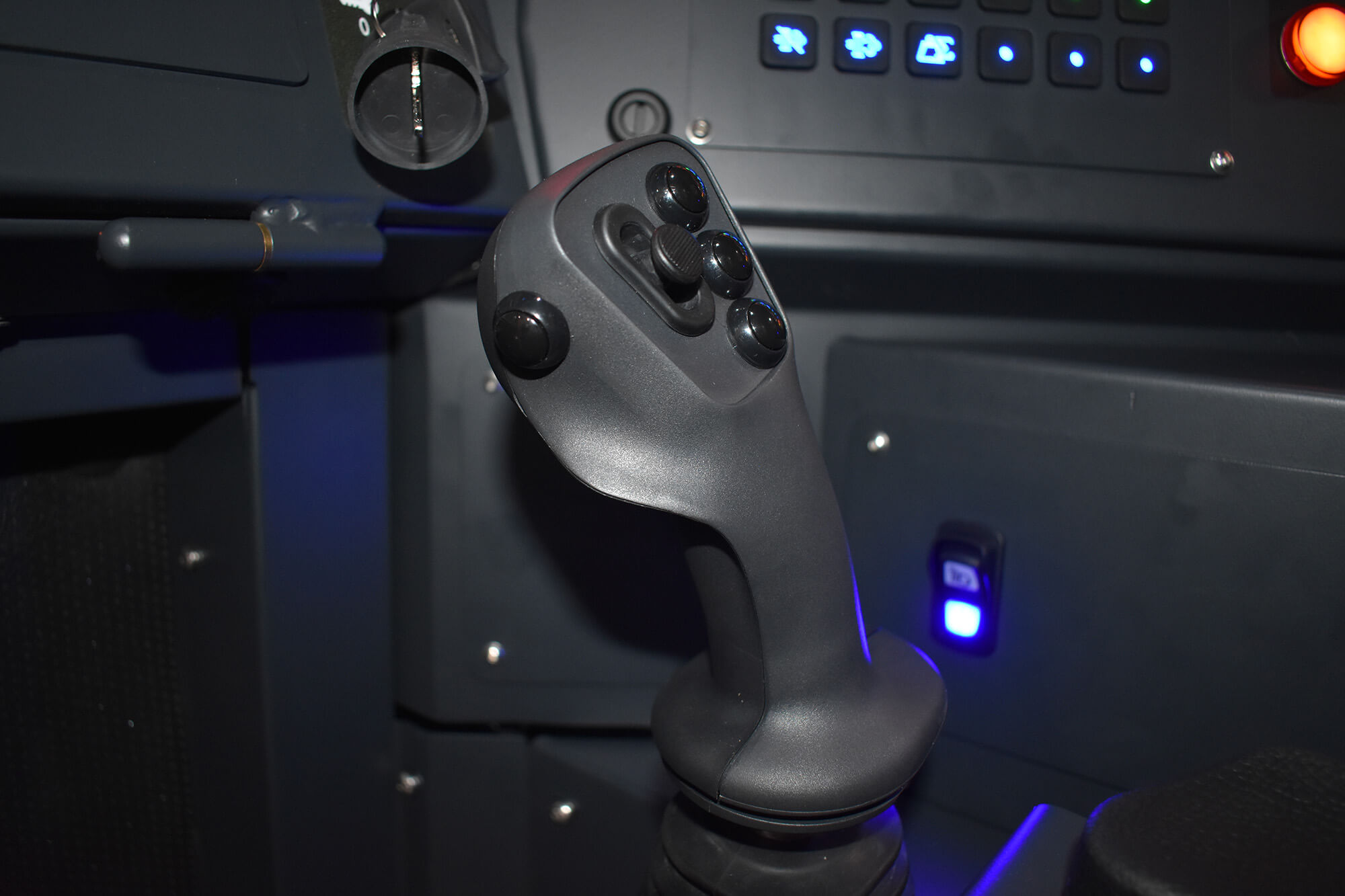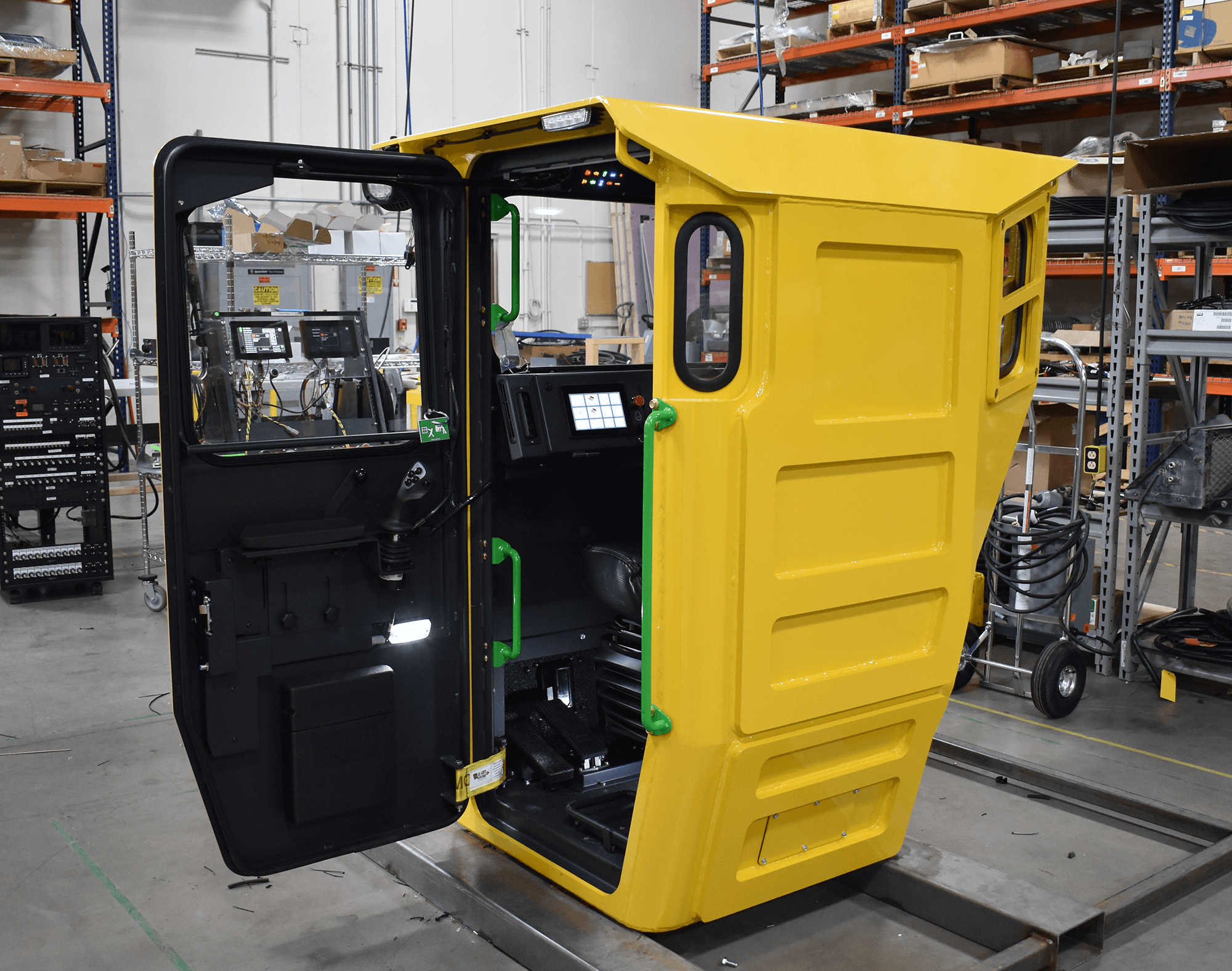 Go inside this scalable compact cab designed for an underground mining machine. Engineered to fit many control functions into a small space through an extended front and side dashboard, complete with illuminated push buttons and programmable displays, and attaching one of the joysticks to the door.