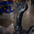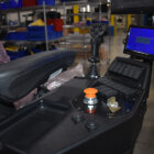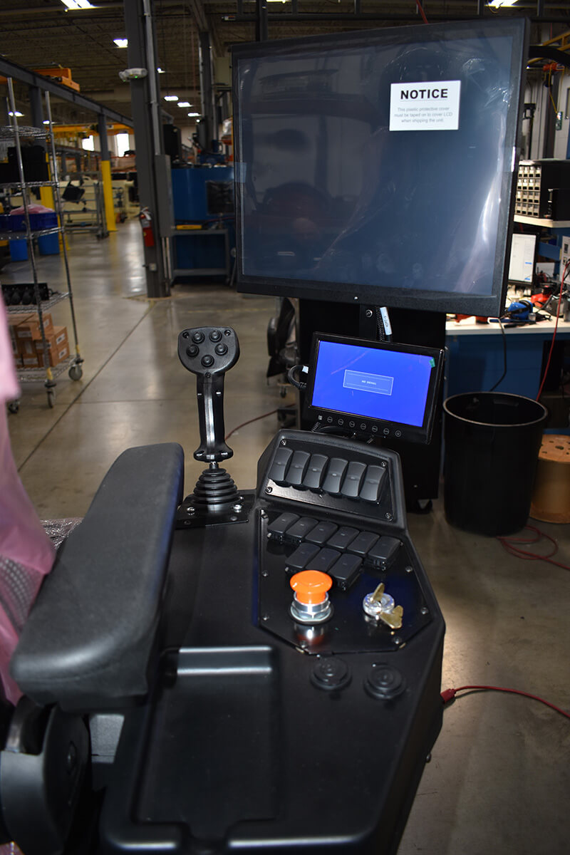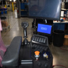 Take a closer look at this custom armrest assembly designed for a 180-degree rotating seat in the rail industry. It utilizes 2 custom switch panels, one with 6 horizontal rockers switches and one with 9 rocker switches and e-stop function. There is also a custom joystick, as well as an attached display and computer monitor.