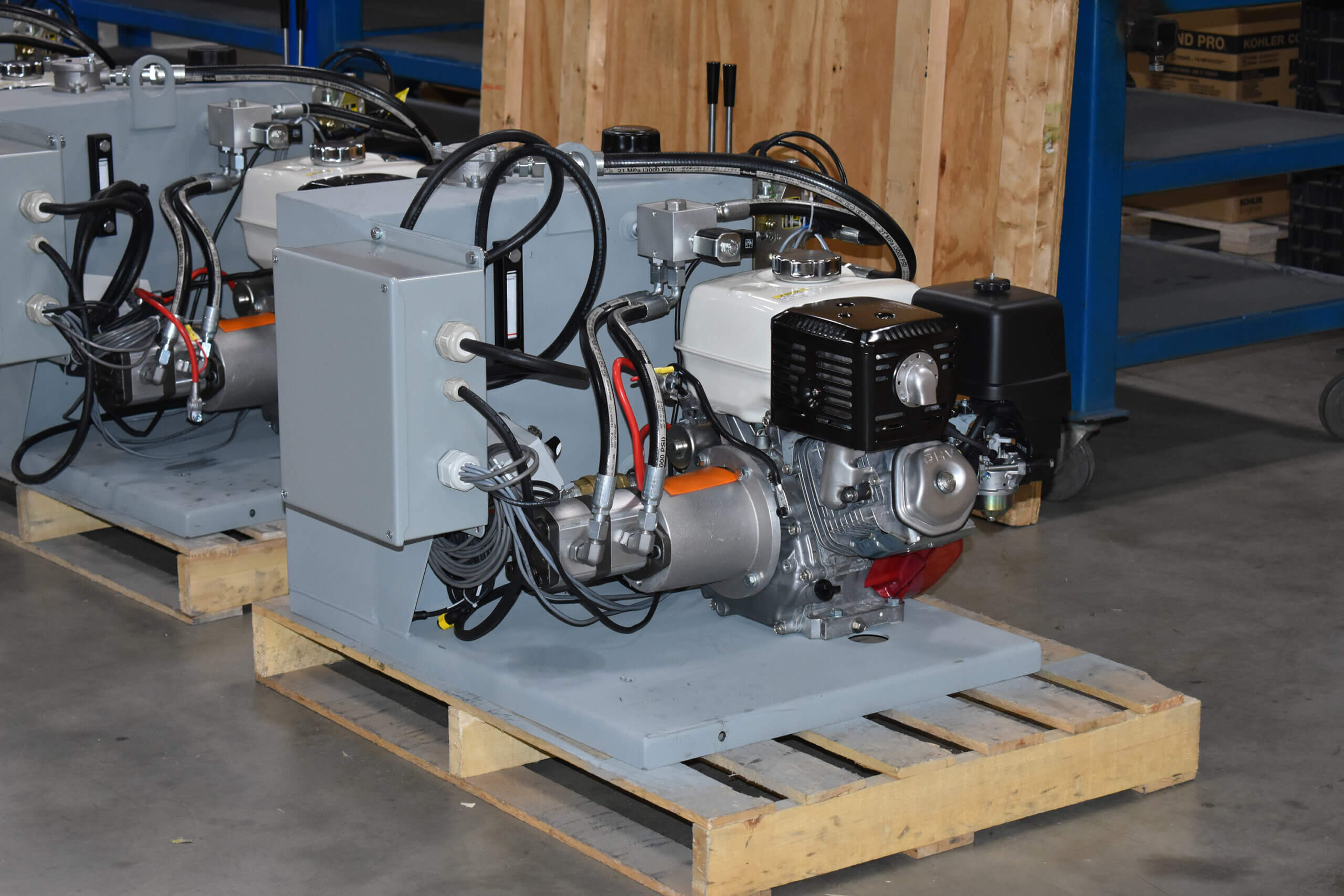 This custom hydraulic power unit has a 16 gallon reservoir assembly, a custom power scaffold control box, and a combined pump flow manifold.