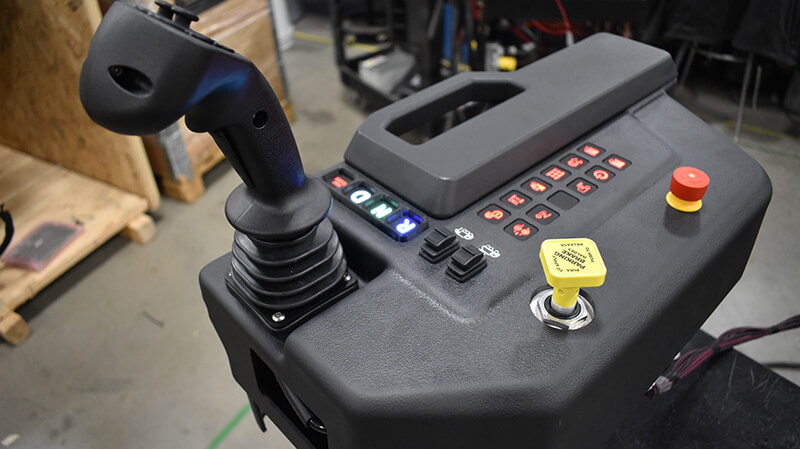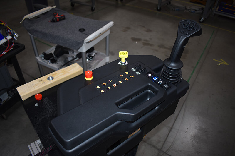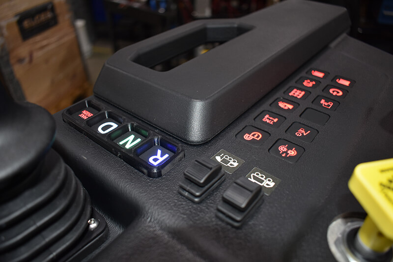 Additionally, we developed custom, lit keypads, including one that acts as a gear shift, with Forward, Neutral, and Drive controls. This switch panel is another PWM signal from the machine’s control system so it can communicate to the transmission, allowing the truck to drive if the CAN line wasn’t functioning.