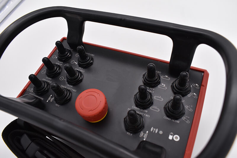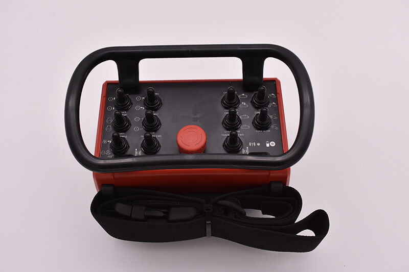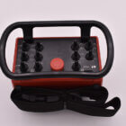 Take a 3D look at this wireless belly pack designed for optimal usability with a neck strap. It is a fully scalable handheld wireless remote control with a 300+ feet signal range allowing operators to perform all machine functions from a safe distance. The control is designed with 10 top toggle switches, 6 side push buttons, and a top e-stop function.