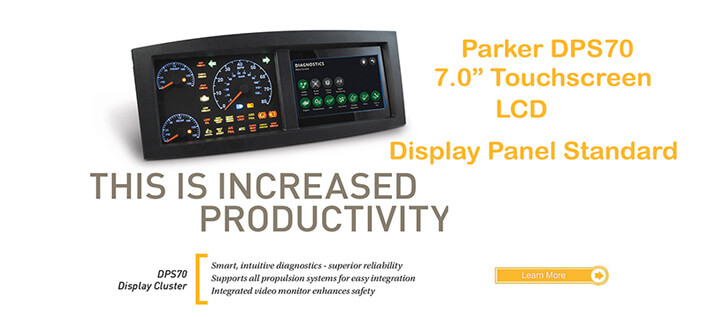Parker’s DPS70 is a semi-custom instrument cluster with a 7″ LCD touch screen is an innovative user interface for the transportation and mobile industrial markets. Applications include bush and coach instrumentation as well as vehicle operator display. The DPS70 cluster makes complete vehicle information accessible in a single centralized location.